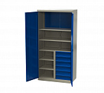 Шкаф инструментальный серии «PROFFI» предназначен для хранения оснастки, приспособлений и инструмента на рабочих местах в мастерских, цехах и других производственных зонах. Шкаф изготовлен из листовой стали и обеспечивает надежное запирание дверей ригельной системой. Шкаф содержит четыре ящика, одна перегородка и восемь полок. Размеры:(ВхШхГ) 1800x1000x500 мм. Масса: 71,4 кг. Нагрузка на полку – не более 100 кг. Нагрузка на перекладину - не более 15 кг. Суммарная нагрузка на шкаф не более 400 кг.