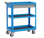 Корпус выполнен из листовой стали толщиной от 0,6 до 1,5мм., покрыт полимерной порошковой краской. С выдвижным ящиком на шариковых телескопических направляющих. Комплект резиновых ковриков. Общая равномерно-распределённая нагрузка на тележку - до 100кг. Верхняя и средняя полка имеют высоту борта 40 мм., нижняя полка имеет высоту борта 60 мм. Размер 950х800х450 мм.