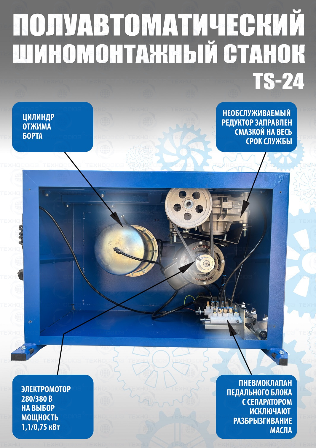 шиномонтажного станка TS-24. Полуавтоматический. Квадратный стол. Для дисков:11÷24”. Усилие отрыва покрышки 2700 кг. В комплекте: пистолет с манометром для подкачки шин + монтажка + пластиковые накладки на зажимные кулачки + регулятор давления с влагоотделителем и манометром